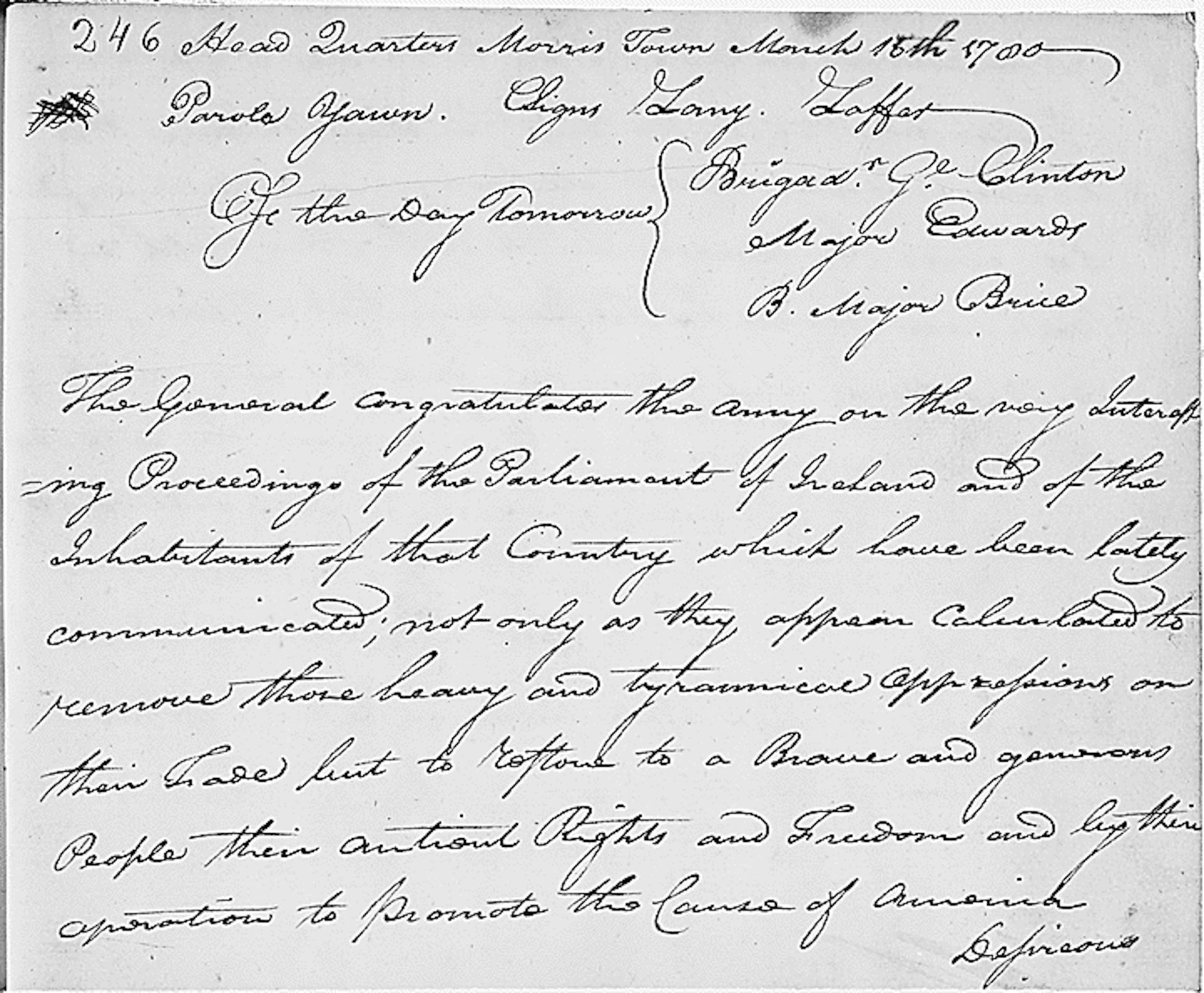 Cheers were raised for George Washington and “the American army,” but also for Irish patriots such as Henry Grattan and Henry Flood. “May the field pieces of Ireland bellow,” proclaimed one soldier, “till the nation is free.”